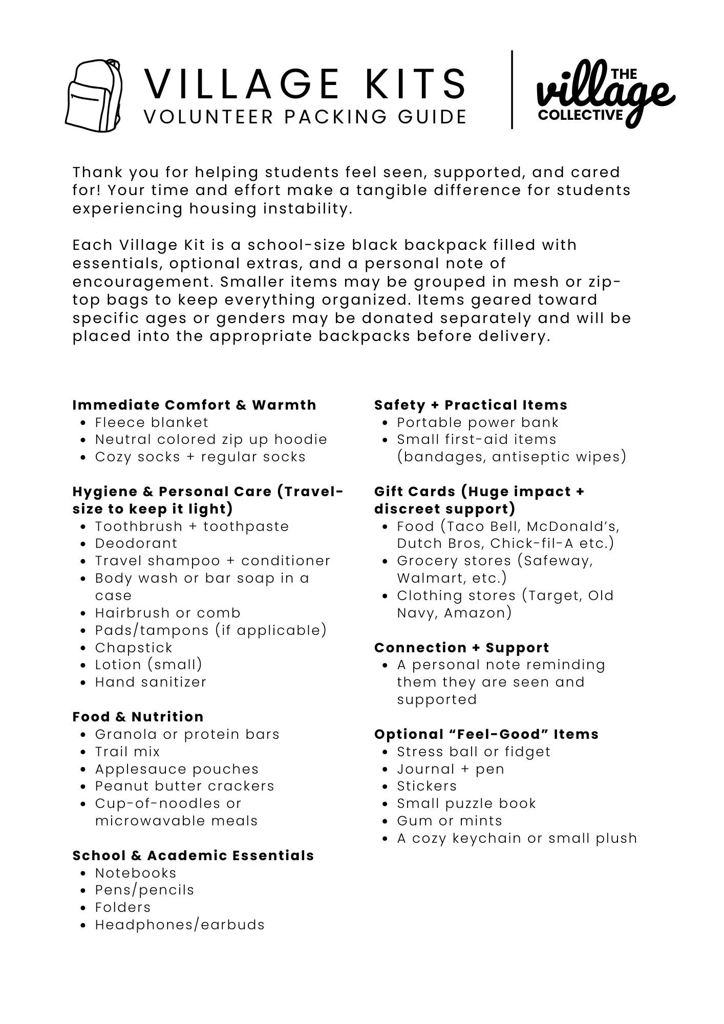 Village Kits can be assembled with your family, friends, church communities, Bible studies, Bunco groups—really anyone who wants to support students can participate. We provide the backpacks, and your group fills them with the remaining items.